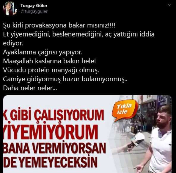 Yandaş Akşam Gazetesi yazarı Turgay Güler, bir sokak röportajında “Bir işte çalışmasına rağmen et yiyemiyorum; karnımı doyuramıyorum” diyen vatandaşın konuşmasını ‘provokasyon’ olarak niteledi.