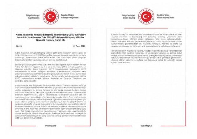 Dışişleri Bakanlığı, Birleşmiş Milletler Güvenlik Konseyi’nin Kıbrıs’taki Barış Gücü’nün (BMBG) görev süresini uzatma kararını sert bir dille kınadı. Bakanlık tarafından yapılan yazılı açıklamada, kararın Kıbrıs Türk tarafının rızası alınmadan kabul edilmesinin Birleşmiş Milletler’in temel ilkelerine aykırı olduğu vurgulandı.