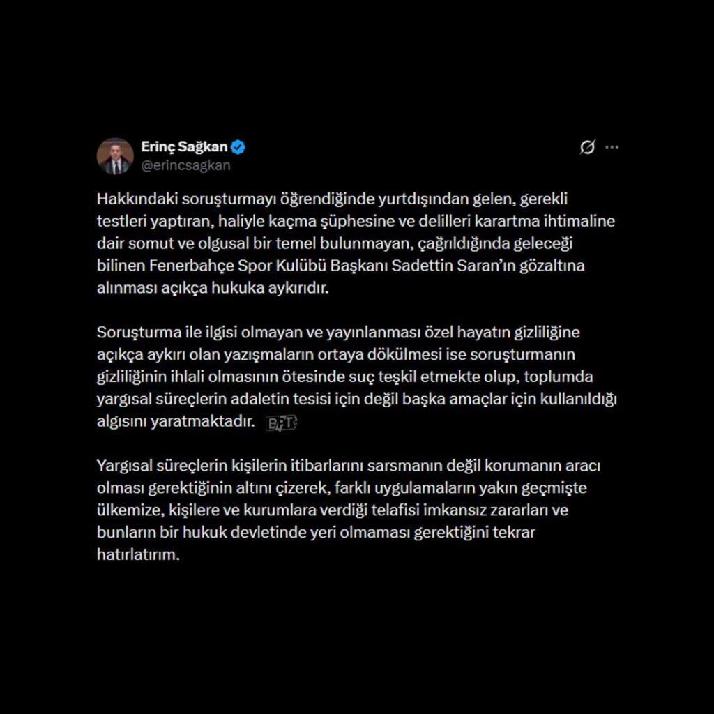 “Hakkındaki soruşturmayı öğrendiğinde yurtdışından gelen, gerekli testleri yaptıran, haliyle kaçma şüphesine ve delilleri karartma ihtimaline dair somut ve olgusal bir temel bulunmayan, çağrıldığında geleceği bilinen Fenerbahçe Spor Kulübü Başkanı Sadettin Saran’ın gözaltına alınması açıkça hukuka aykırıdır.”