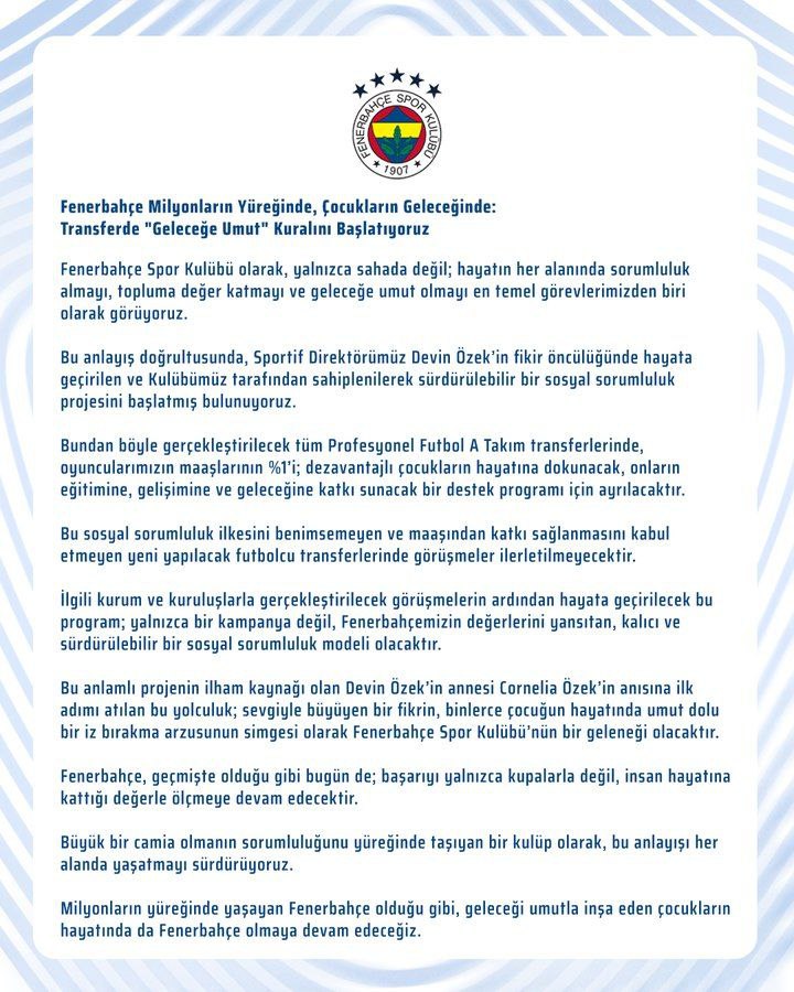 Fenerbahçe Spor Kulübü, yapılacak yeni transferlerde Türk spor kamuoyuna örnek olacak bir sosyal sorumluluk adımı atmaya hazırlanıyor. Kulüp yönetimi, transfer edilecek futbolcuların maaşlarının %1’inin dezavantajlı çocukların eğitimi ve gelişimi için ayrılmasını içeren bir proje üzerinde mutabakata vardı.