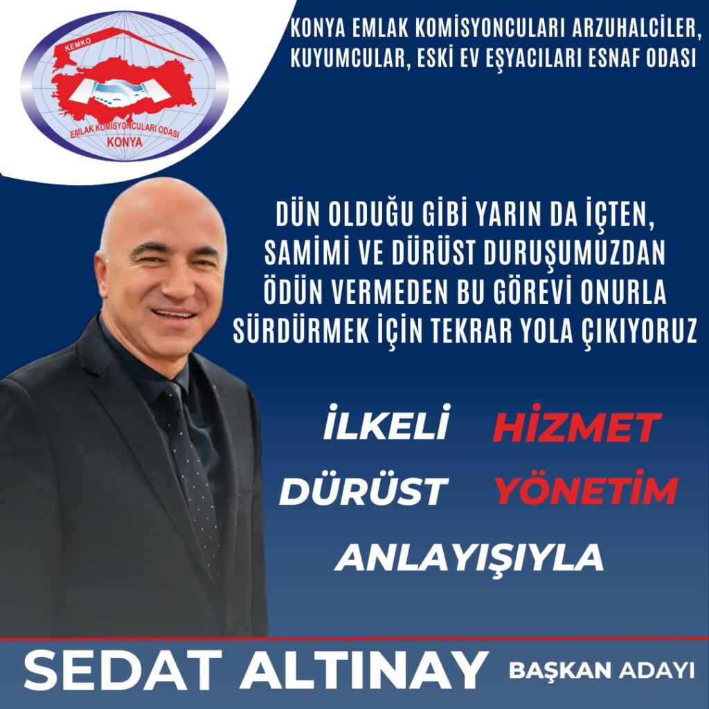 Konya Emlak Komisyoncuları, Arzuhalciler, Kuyumcular ve Eski Ev Eşyacıları Odası’nın efsane başkanı Sedat Altınay, yıllardır başarıyla yürüttüğü görevine yeniden talip oldu. Konya esnafının gönlünde taht kuran, samimiyeti ve dürüst duruşuyla tanınan Sedat Altınay, “Dün olduğu gibi yarın da aynı içtenlik ve doğrulukla hizmet etmeye devam edeceğiz” diyerek tekrar adaylığını açıkladı.