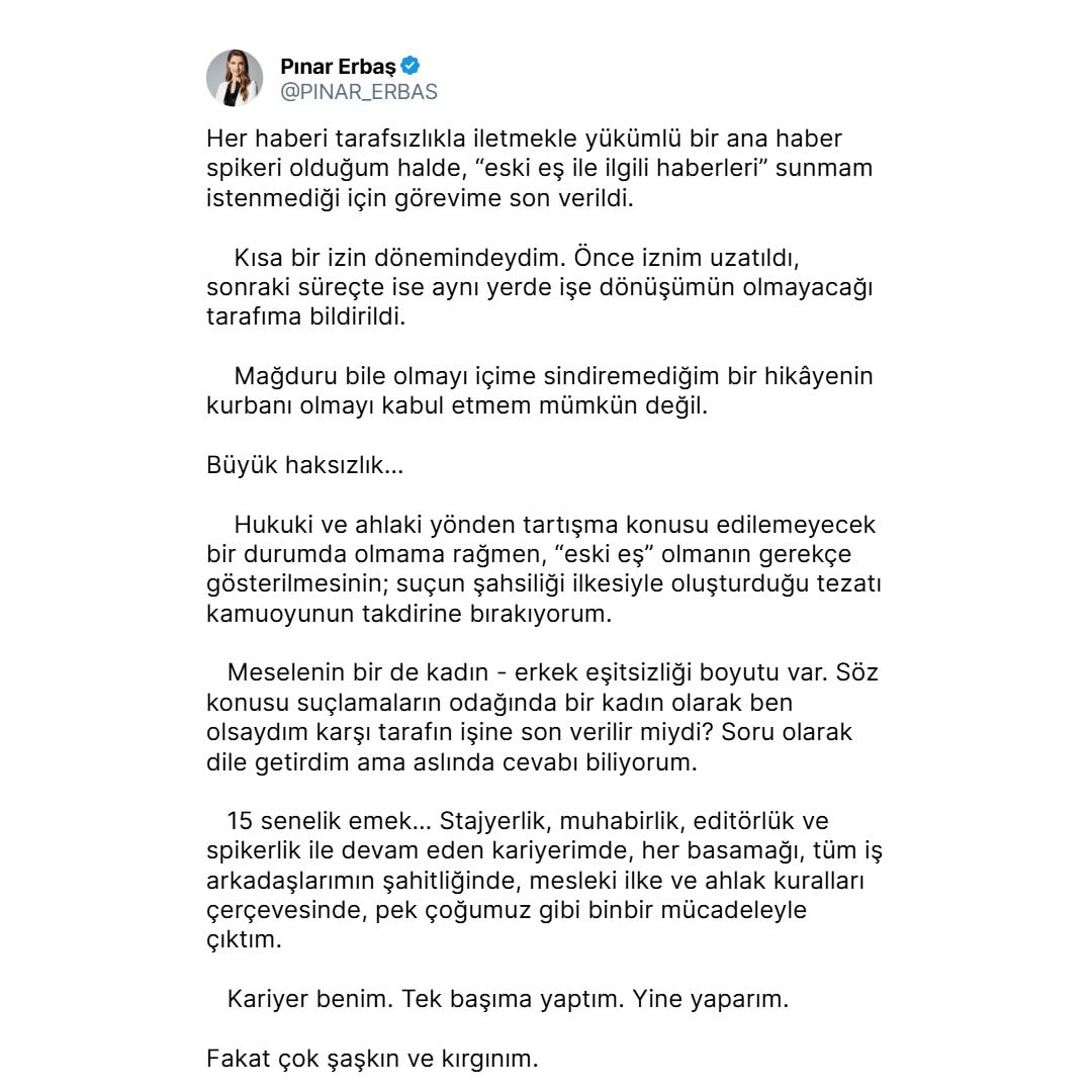 Sosyal medya hesabından açıklama yapan Erbaş, bir ana haber spikeri olarak tüm haberleri tarafsızlıkla sunmakla yükümlü olduğunu vurguladı. Buna rağmen, “eski eş ile ilgili haberleri” sunmasının istenmediğini belirten Erbaş, bu gerekçeyle görevine son verildiğini ifade etti.