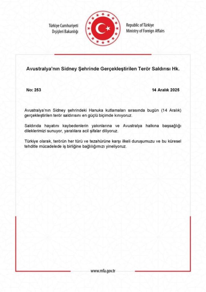 Dışişleri Bakanlığı, Avustralya’nın Sidney şehrindeki Hanuka kutlamaları sırasında gerçekleştirilen terör saldırısını kınadı.