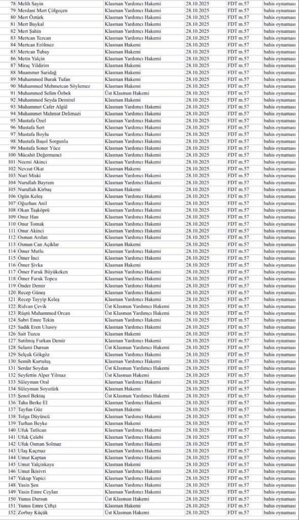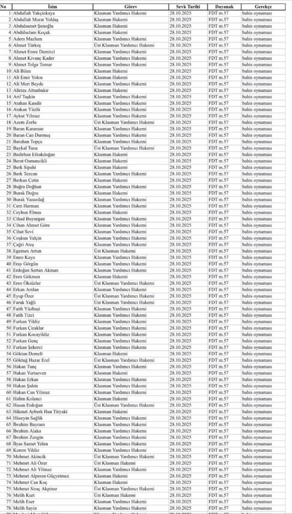 Türkiye Futbol Federasyonu tarafından bahis oynadığı gerekçesiyle PFDK’ya sevk edilen 152 hakemin listesi yayınlandı.